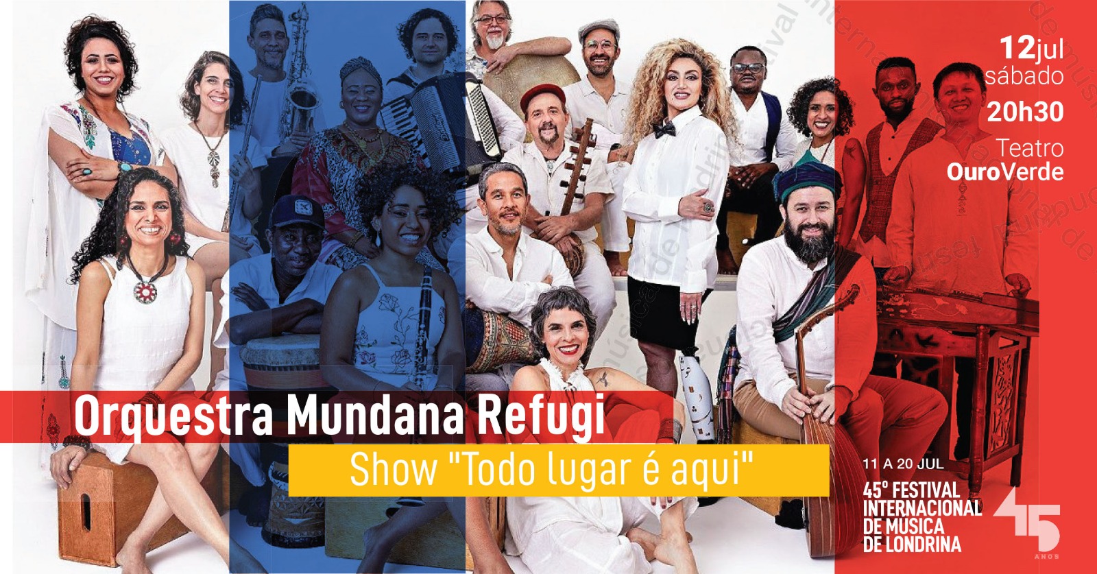 ORQUESTRA MUNDANA REFUGI, formada por vinte e dois músicos imigrantes, refugiados e brasileiros de dez nacionalidades, sob a direção musical de Carlinhos Antunes, apresenta um repertório repleto de diversidade musical que reflete as culturas de seus integrantes. Os instrumentos vão do kanun ao acordeom, passando pelo piano, Kemanche, cítara chinesa, bouzouki, alaúde, ronroco, derbak, djembe, doudouk e tantos outros. Os shows apresentam temas e canções dos dois primeiros álbuns ( 2017 e 2019) e canções inéditas. Destaque para “Oración del Remanso” (Jorge Fandermole- Argentina) e “Sardinia Mia (Sardinia Mémories (Geoffrey Oryema- Uganda).
