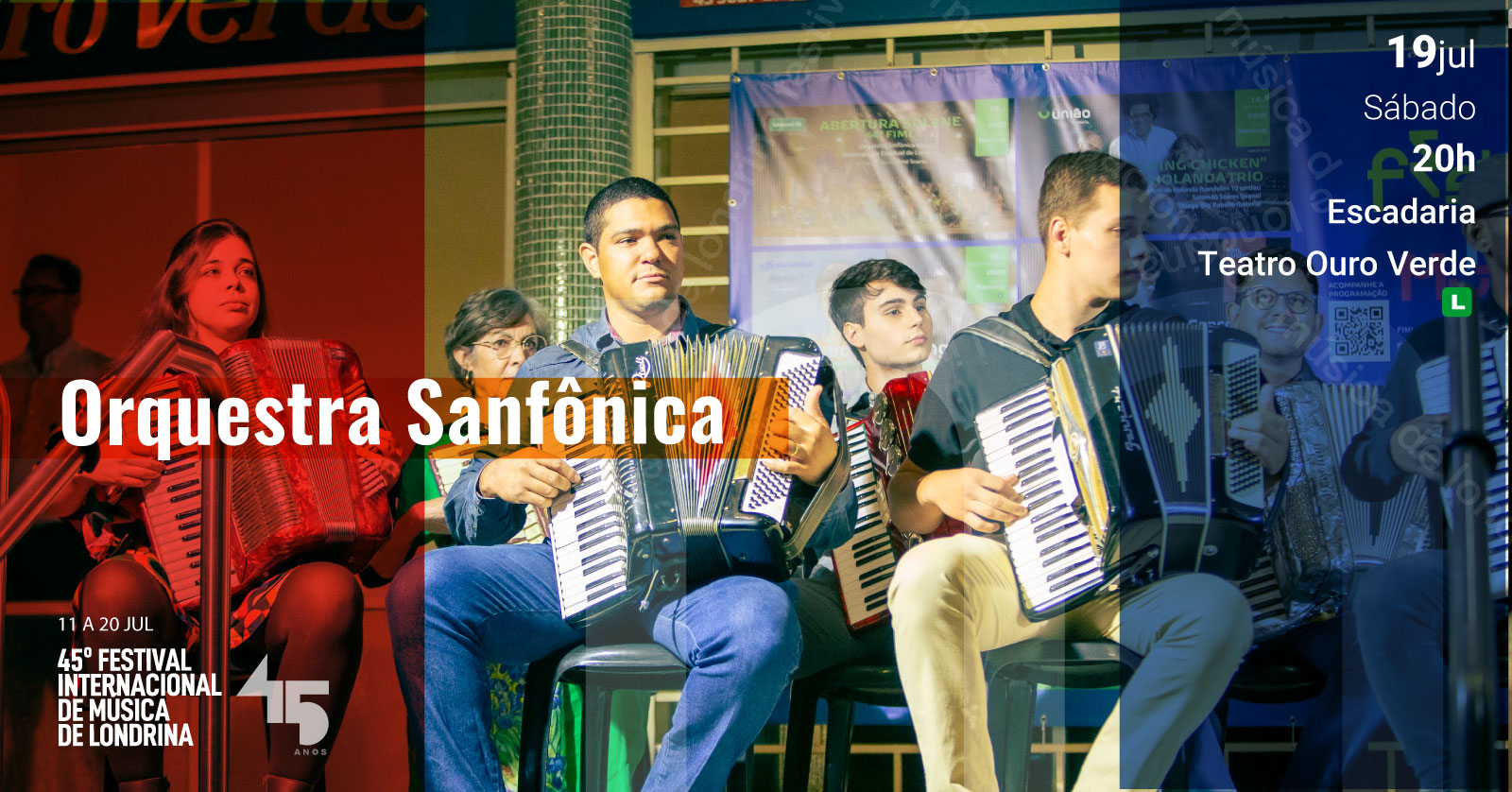 Os alunos da turma de Acordeon do 45º FIML formam a Orquestra Sanfônica do Festival e fazem uma linda apresentação nas escaderias do Teatro Ouro Verde. Além do professor Miguel Santos, a Orquestra estará acompanhada dos musicistas Gabriel Zara (baixo) e Andre Vercelino (percussão).